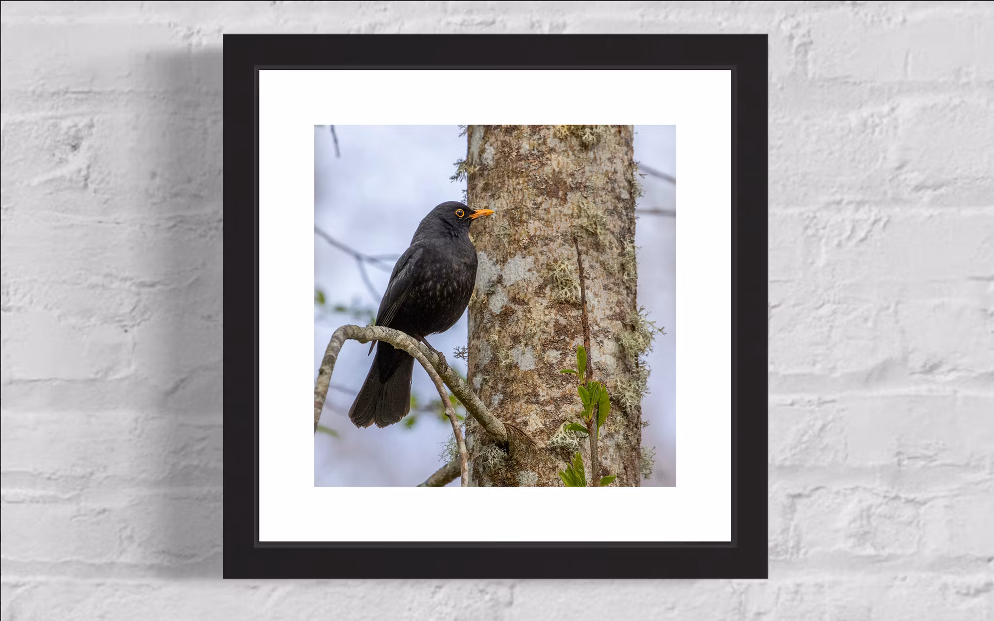 Fine Art Print. Fotokonst av Per Johansson - Joanzon art. 30 x 30 cm. Signerad, obegränsad upplaga. Motiv: Koltrast på gren.